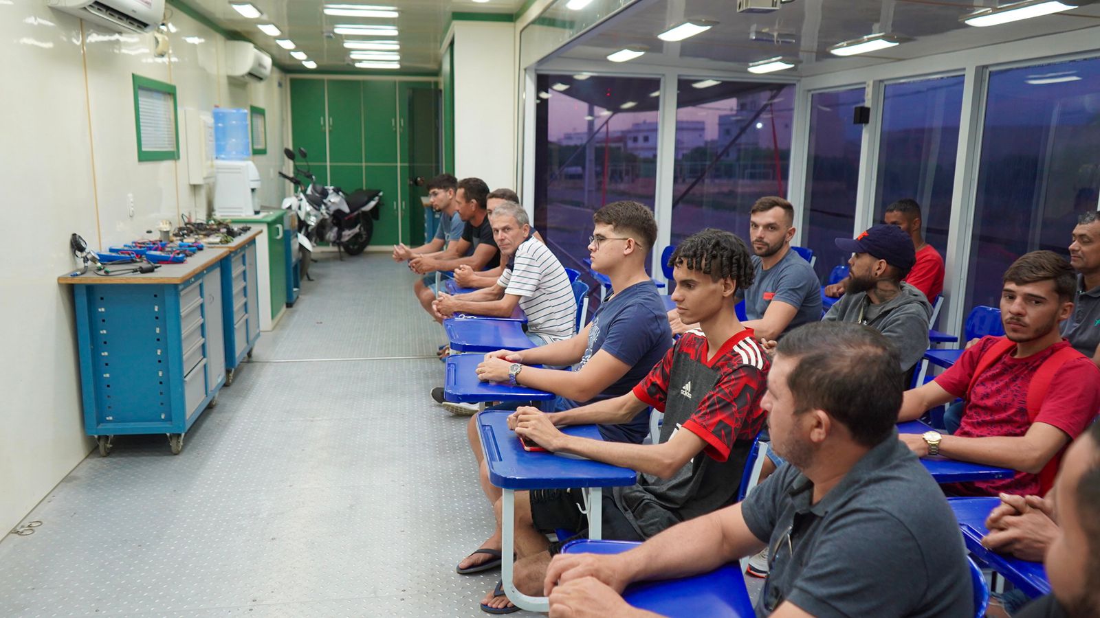 O curso tem 40h/aula de conteúdo teórico e prático, que prepara os alunos para trabalhar com a parte elétrica de motocicletas e jet skis. Alguns dos participantes já possuem experiência com mecânica de motos, mas precisavam aprender sobre a parte elétrica.